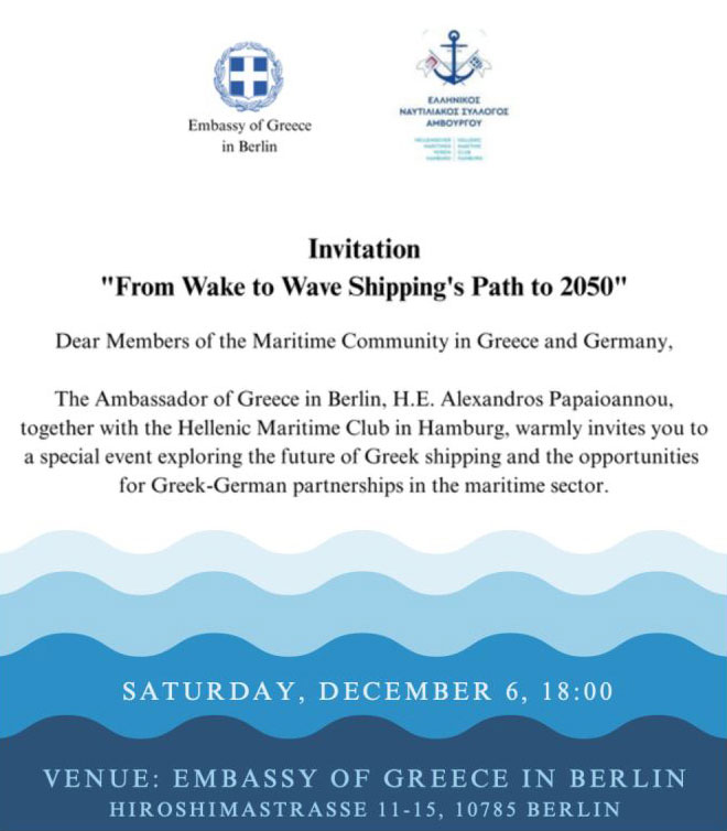 “From Wake to Wave: Shipping Path to 2050” in Berlin, organized by the Hellenic Maritime Club Hamburg.
